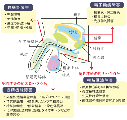 女性因子が不妊の原因に多いとされていますが、男性因子も約半数はあるとされています。特に不規則な生活や、ストレス環境によるEDを含む性機能障害は近年増加傾向にあります。