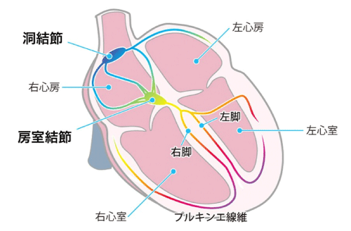 心臓は全身に血液を送り出すポンプの働きをしている。ポンプを動かしているのは電気刺激である。まず、右心房にある洞房結節 (SA node) が興奮し、電気刺激が心房を介し右心房の下方にある房室結節へと伝わる。更に興奮は房室結節からヒス束、プルキンエ線維へと伝導し、心筋全体へと電気刺激が伝わっていく。刺激生成あるいは伝導経路のどこかが障害され、心臓の興奮が正常に伝わらない状態が不整脈を起こす。