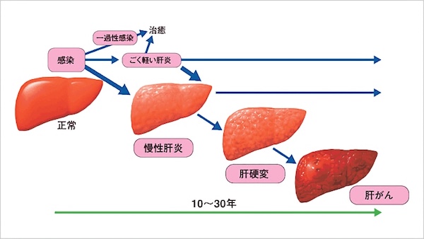 アルコール性、薬害性などの肝炎が慢性へと波及する場合もあるが多くは肝炎ウイルスによるものである。