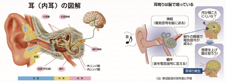 原因不明の耳鳴りが慢性的に続く場合、耳や脳の機能、注意力が関係しているケースがあります。それは、 耳鳴りの仕組みとして、内耳の中にある有毛細胞の機能が弱り、機能が損なわれた場合、脳の中にある聴覚中枢の感覚器や神経の障害により引き起こされることがある為です。