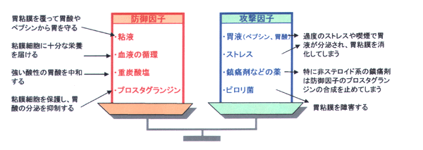 胃への攻撃因子である胃酸と、胃の防御因子である胃粘膜の作用のバランスが崩れて攻撃因子が優勢になると「胃酸過多」となり、胃酸によって胃粘膜が傷つけられてしまい、胃炎や胃潰瘍などにつながる。