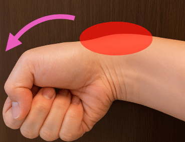 拇指使用時に、手関節拇指側の痛みや腫脹、圧痛が出現します。